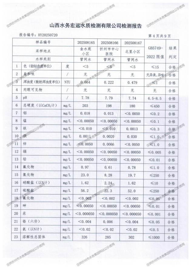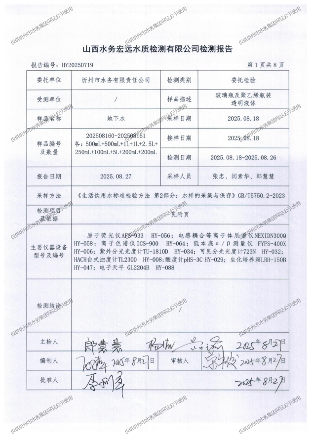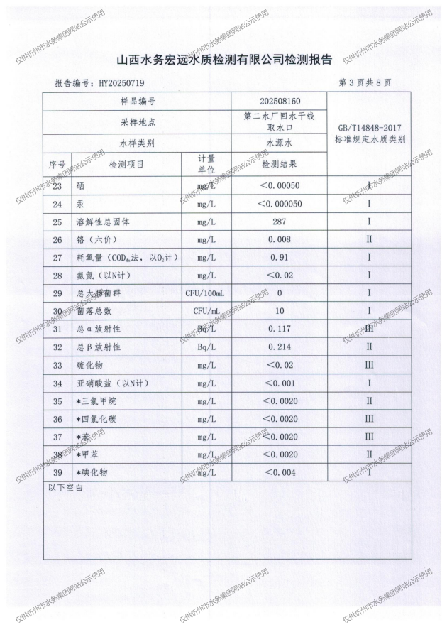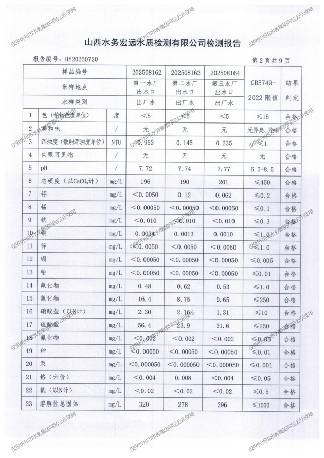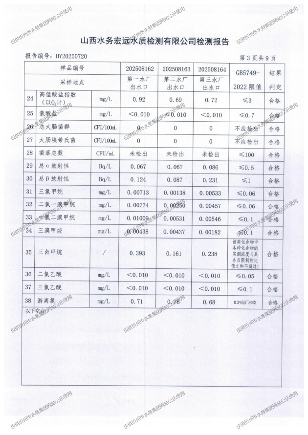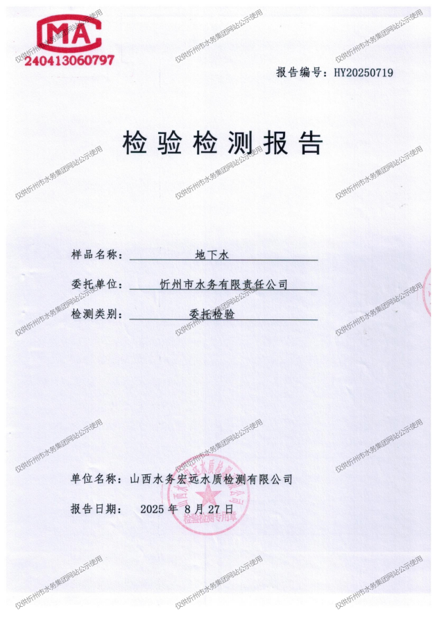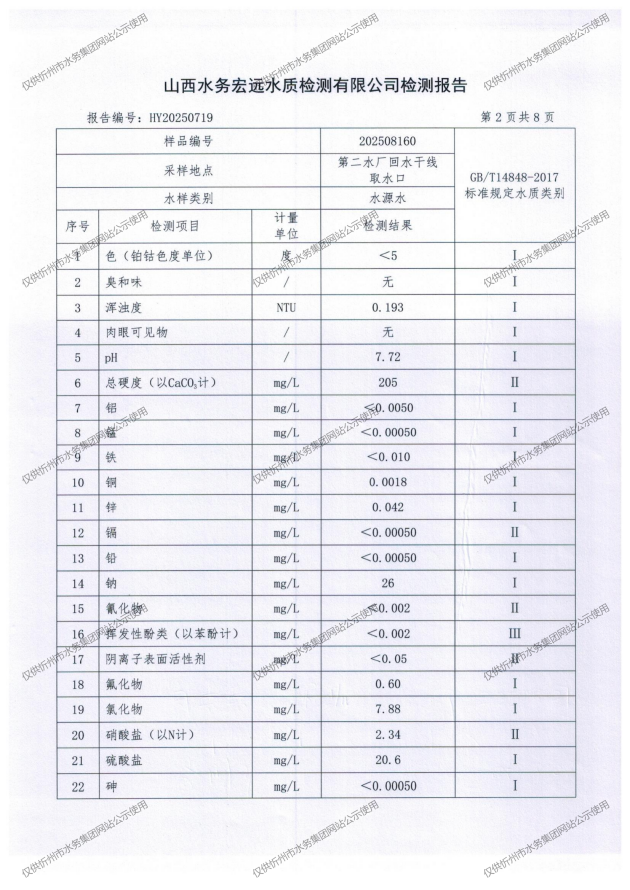 忻州城區(qū)公共供水水源水、出廠水、管網水、管網末梢水2025年8月份水質信息公示