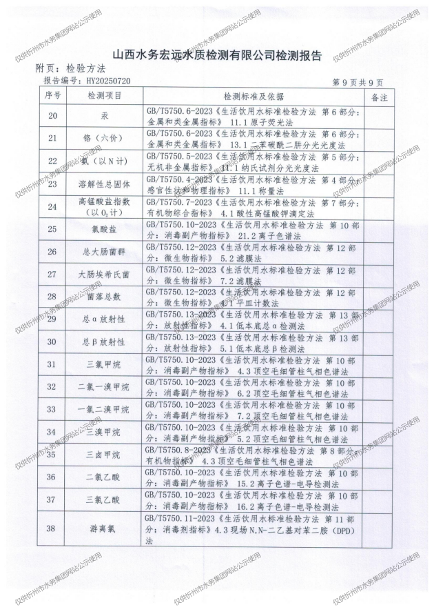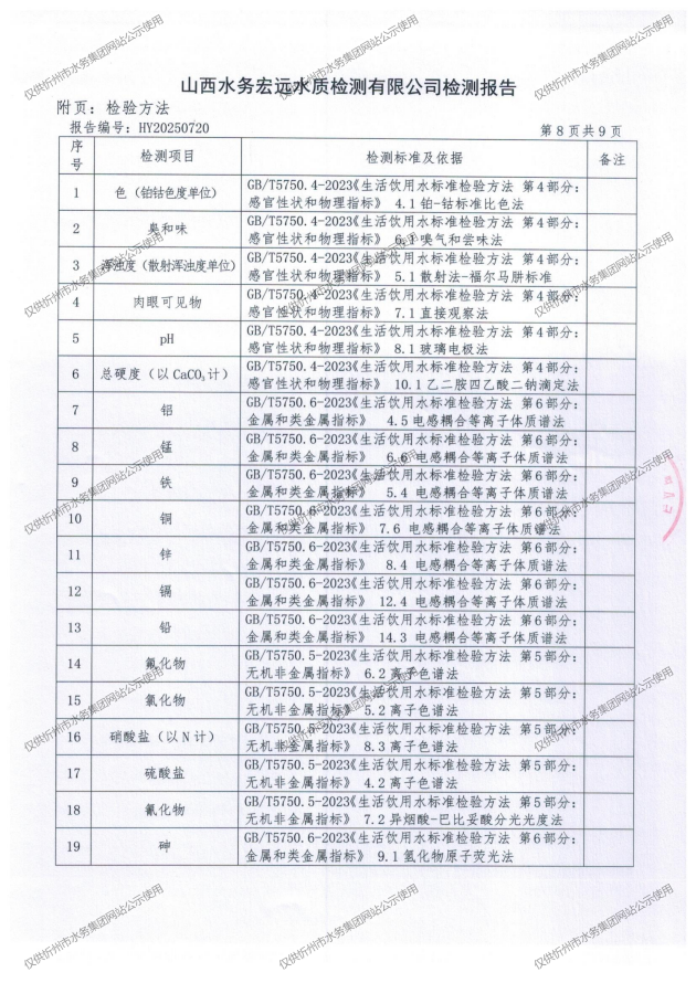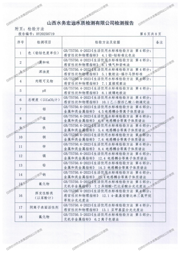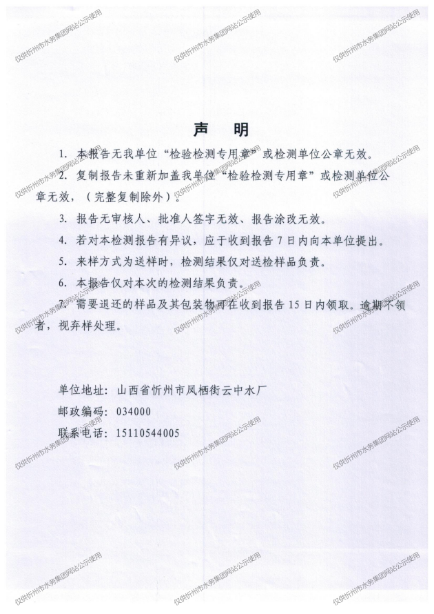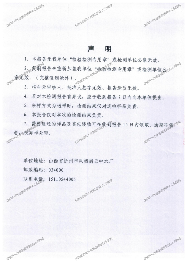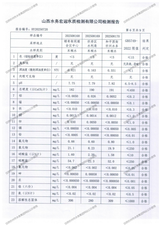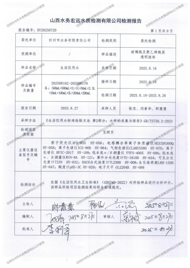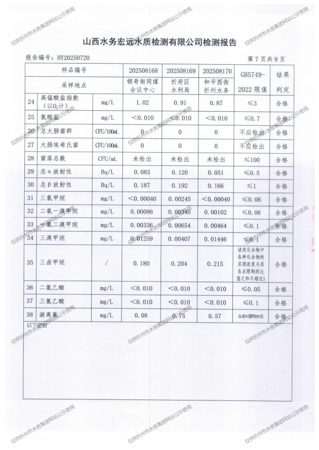 忻州城區(qū)公共供水水源水、出廠水、管網水、管網末梢水2025年8月份水質信息公示