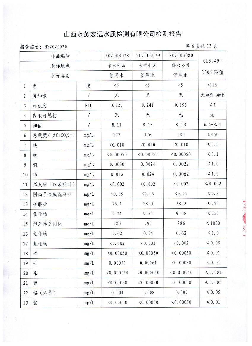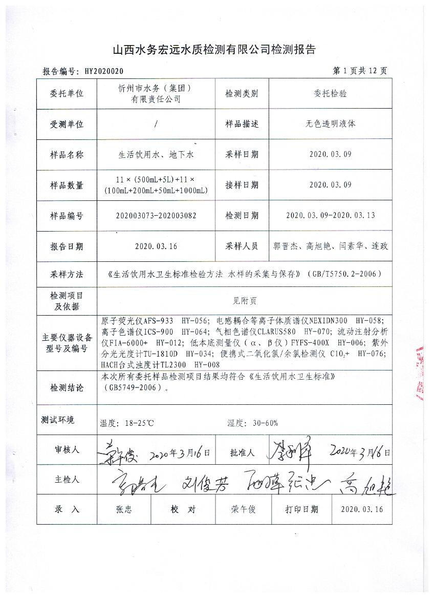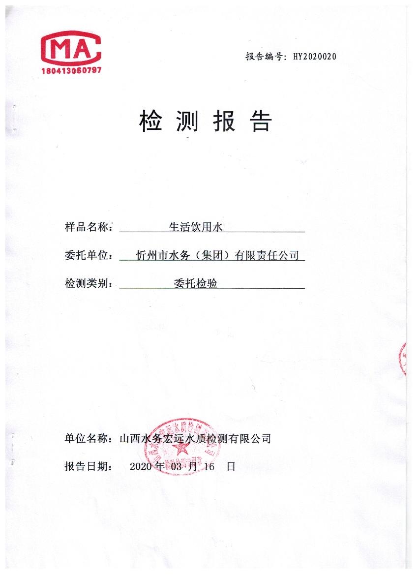 忻州城區(qū)公共供水水源水、出廠水、管網水、管網末梢水2020年3月份水質信息公示