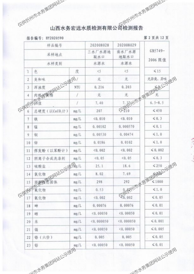 忻州城區(qū)公共供水水源水、出廠水、管網(wǎng)水、管網(wǎng)末梢水2020年8月份水質(zhì)信息公示
