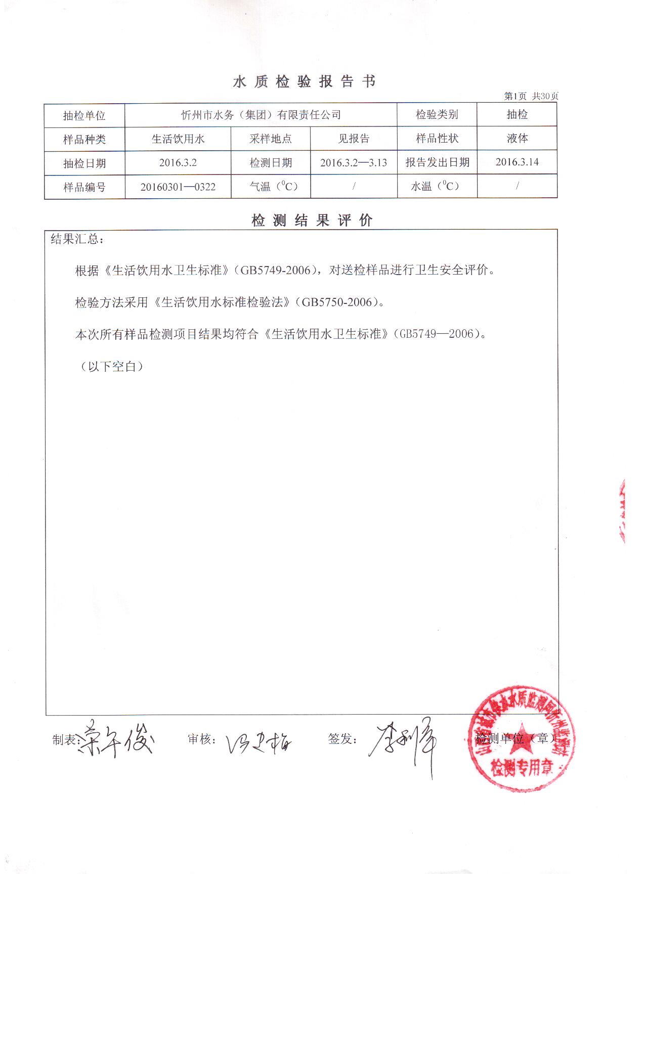 忻州城區(qū)公共供水2016年第一季度生活飲用水水質信息